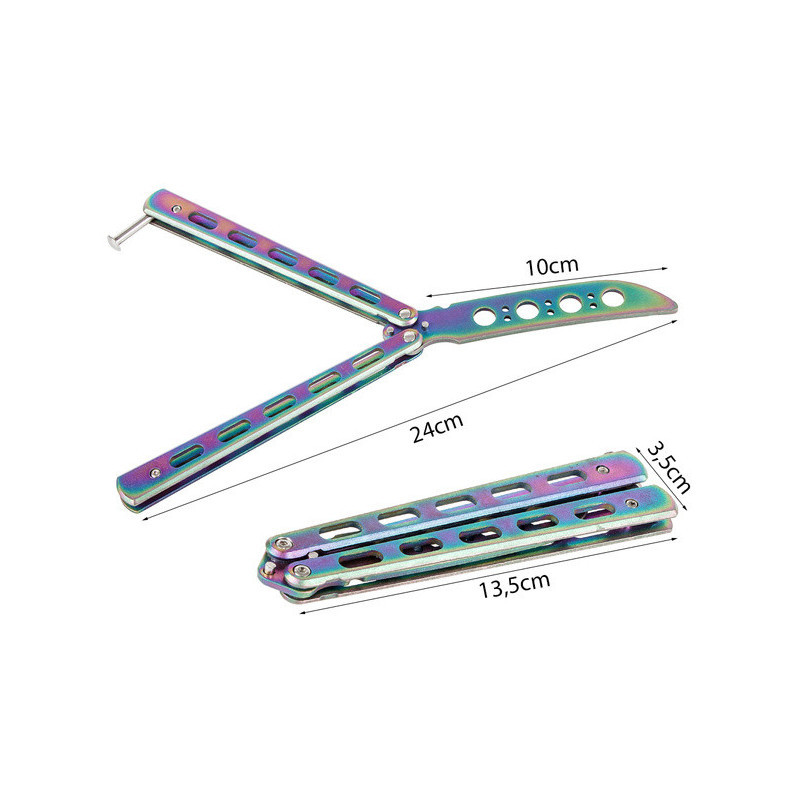 Verbessere deine Tricks sicher mit diesem stumpfen Butterfly-Trainingsmesser, das speziell für Übungen und das Erlernen von Tricks entwickelt wurde. Dank der rostfreien Stahlkonstruktion ist es robust und langlebig, während die stumpfe Klinge eine sichere Handhabung garantiert, selbst für absolute Anfänger.