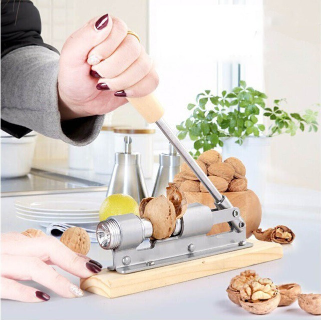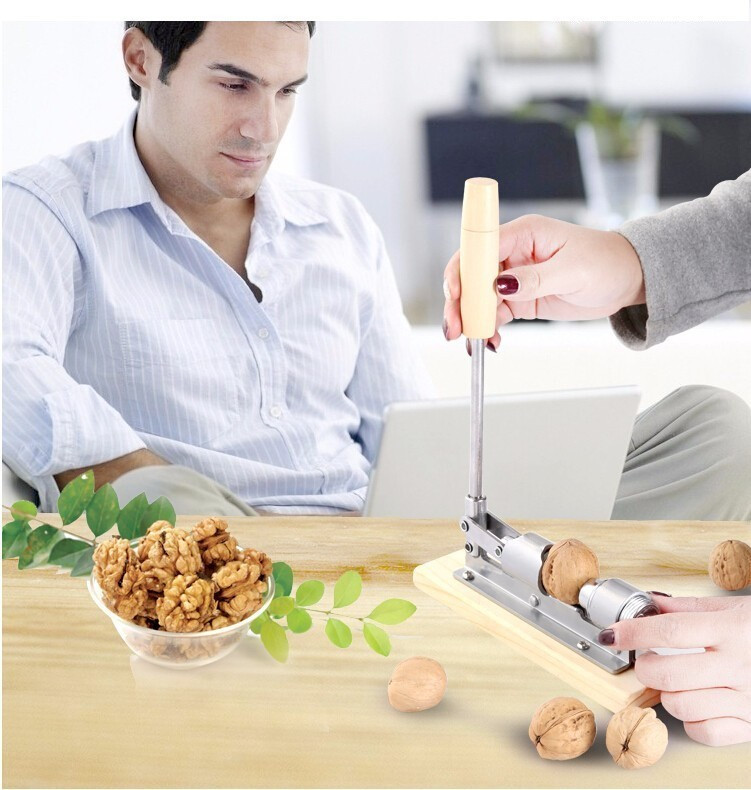 Dank des Designs aus rostfreiem Stahl ist es robust und dennoch leicht zu reinigen. Das Produkt verfügt über einen Holzfuß, um ein Verrutschen zu verhindern. Um Nüsse zu knacken, musst du nur die richtige Größe einstellen, damit die Nuss stabil steht, und dann den Hebel nach unten drücken, um die Schale zu knacken.