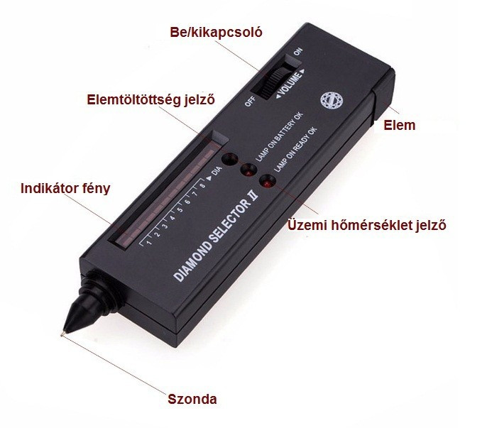 Um den Tester zu verwenden, schalte das Gerät zuerst ein und warte eine halbe Minute, bis es sich aufgewärmt hat. Sobald die Lampe die richtige Temperatur anzeigt, kannst du die Messung beginnen, indem du den Kopf des Geräts an den Diamanten hältst.