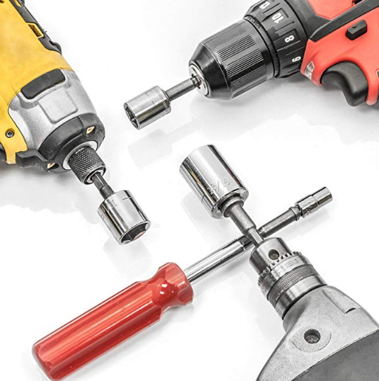 Es verfügt über ¼-Zoll-Sechskantadapter für 3 verschiedene Größen von Steckschlüsseln: 1/4, 3/8, 1/2.