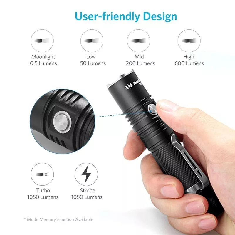 Sie vereint die Leistung von vier durchschnittlichen Taschenlampen, sodass du selbstbewusst die härtesten Gelände meistern kannst. Während der Nutzung kannst du zwischen verschiedenen Beleuchtungsfunktionen wählen: niedrig, hoch und blinkend.