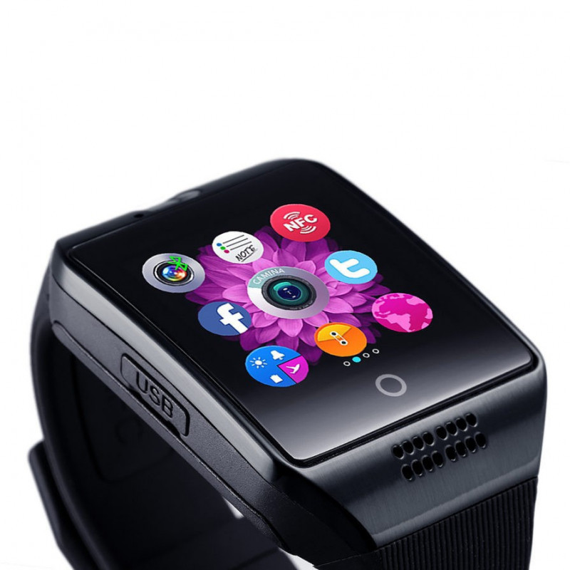 Deutschsprachige Q18 Smartwatch mit Metallgehäuse und gebogenem Display, inklusive integrierter Kamera.