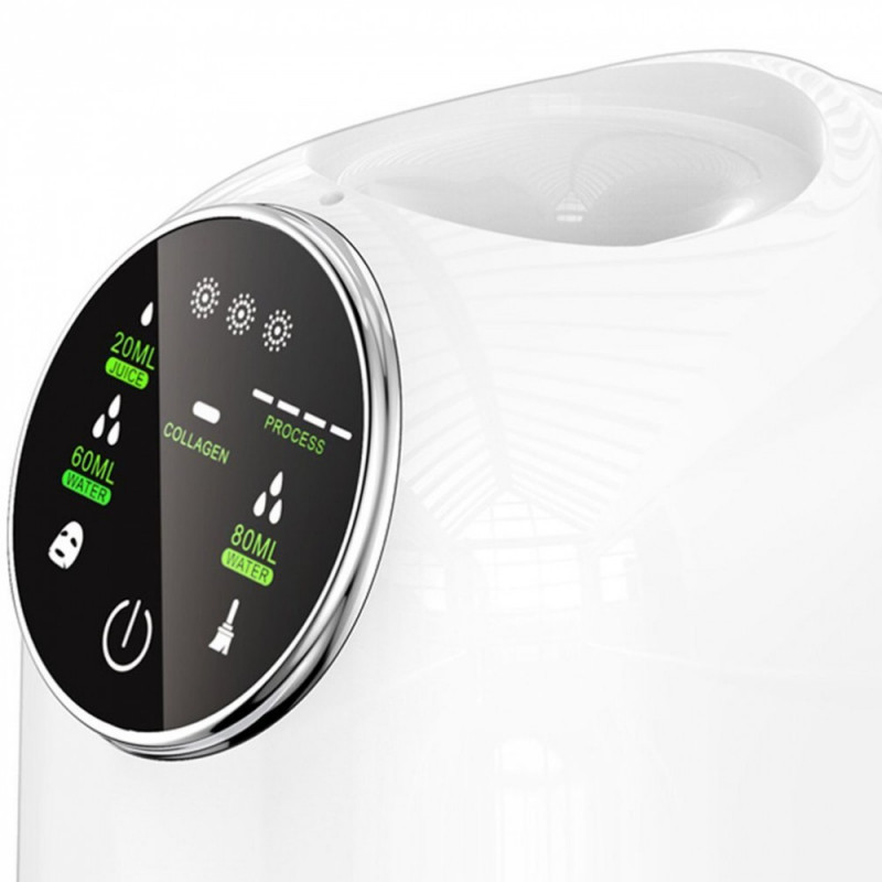 In den automatischen Gesichtsmasken-Hersteller müssen 60 ml Wasser und 20 ml Gemüse- oder Fruchtsaft gefüllt werden (verarbeite die Zutaten mit einem Mixer oder Stabmixer), dann füge eine der im Paket enthaltenen Kollagenkapseln hinzu. Diese Zutaten müssen alle in den oberen Teil des Geräts gegossen werden. Wenn du damit fertig bist, drücke den Einschaltknopf an der Vorderseite des Geräts, und nach etwa 3-5 Minuten (das Gerät signalisiert, wenn es fertig ist), drücke den Knopf oben, während du es über das Plastiktablett hältst, und lass die Mischung heraus. Warte ein paar Minuten, dann entferne die fertige Maske mit dem kleinen Plastikmesser aus der Form, lege sie auf dein Gesicht und entspanne dich.