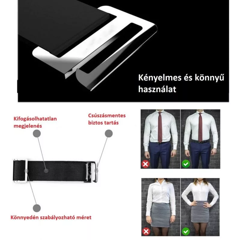 Du kannst das Gadget bequem mit deinen Hemden verwenden. Befestige es am untersten Knopf deines Hemdes und ziehe es um deine Taille! Verbinde das Gadget und stelle die gewünschte Breite ein! So einfach ist das. Mit diesen wenigen Handgriffen kannst du ein Leben lang das Tragen von verknitterten Hemden und die unangenehmen „Blitzer“ beim Bewegen vermeiden.