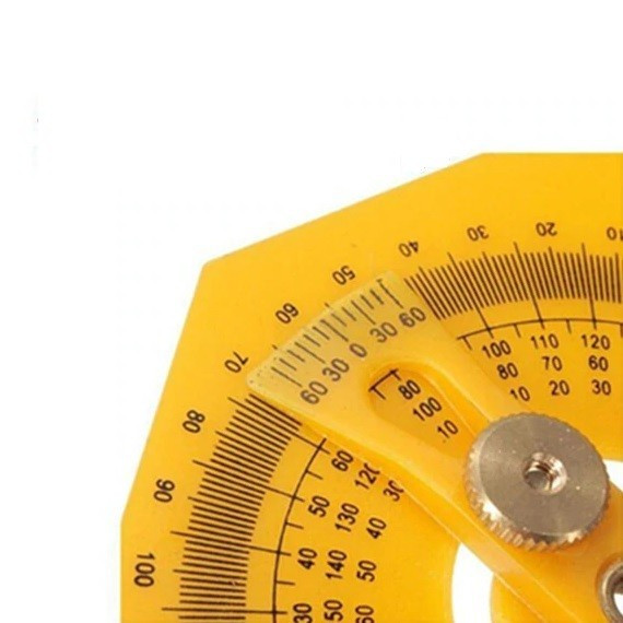 Mit der Skala auf dem Produkt kannst du im Bereich von 180 Grad messen, ohne Winkel konstruieren zu müssen. Zwei der drei Zahlenreihen sind von rechts nach links und von links nach rechts ablesbar, während die dritte bei der Abweichung vom rechten Winkel hilft.