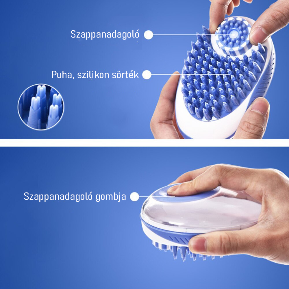 Warum? Weil die Badebürste mit einem kleinen Behälter und einem Spender ausgestattet ist. Fülle einfach das Duschgel deines Haustiers in das Gerät, gib etwas Wasser hinzu und verschließe den Behälter wieder. Danach musst du nur noch den großen Knopf auf der Oberseite der Bürste drücken, um den Inhalt auf das Fell deines vierbeinigen Freundes zu bringen. Zudem schäumt das Seifen-Wasser-Gemisch dank des Designs des Produkts besonders gut.