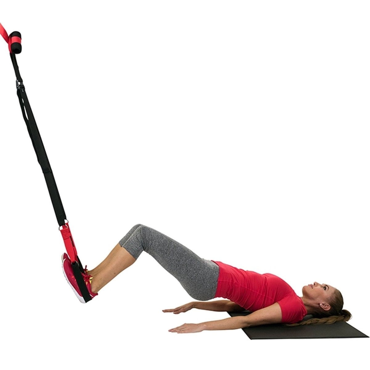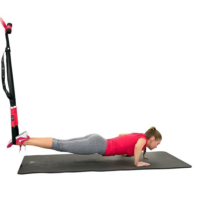 Der Trainer besteht aus superstarken Bändern, strapazierfähigen Befestigungshaken und zwei Griffen. Die Länge der Bänder ist verstellbar, und die Griffe kannst du sowohl mit den Händen als auch mit den Füßen verwenden.