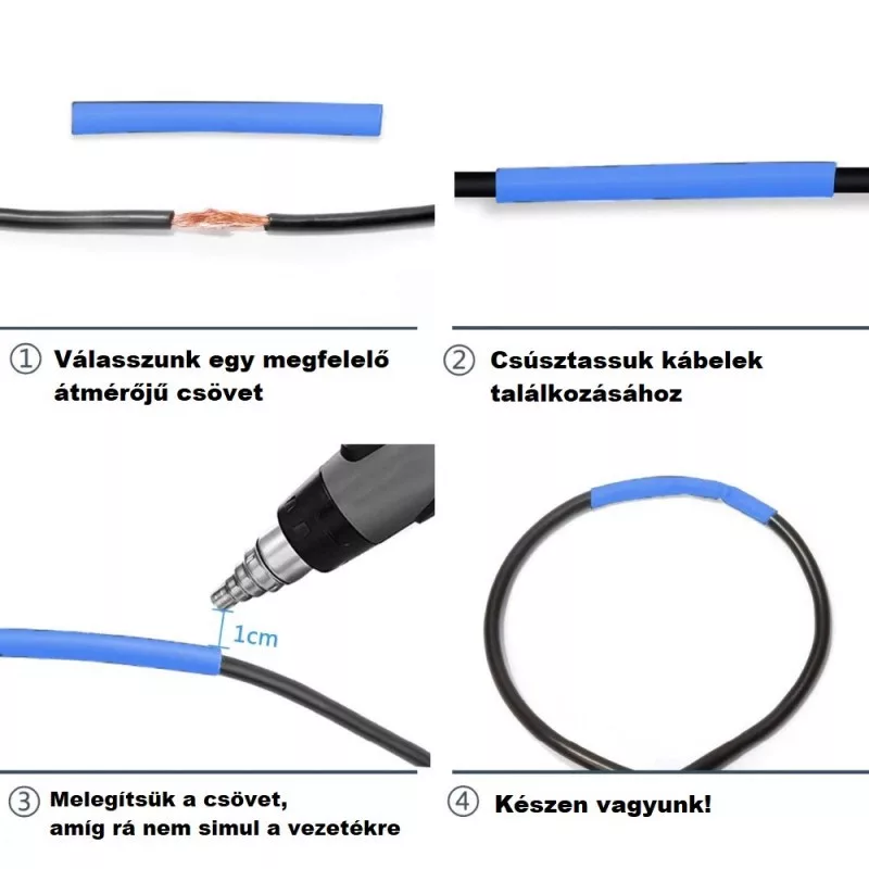 Mit dem Schrumpfschlauch kannst du ganz einfach beliebige Kabel verbinden! Dank des flexiblen Materials lässt er sich leicht anbringen: Zieh ihn einfach über die zu verbindenden Kabel und erhitze den Schrumpfschlauch, der sich durch die Wärme an das Kabel anschmiegt. Er verhindert die Entstehung von Funken und Kurzschlüssen.