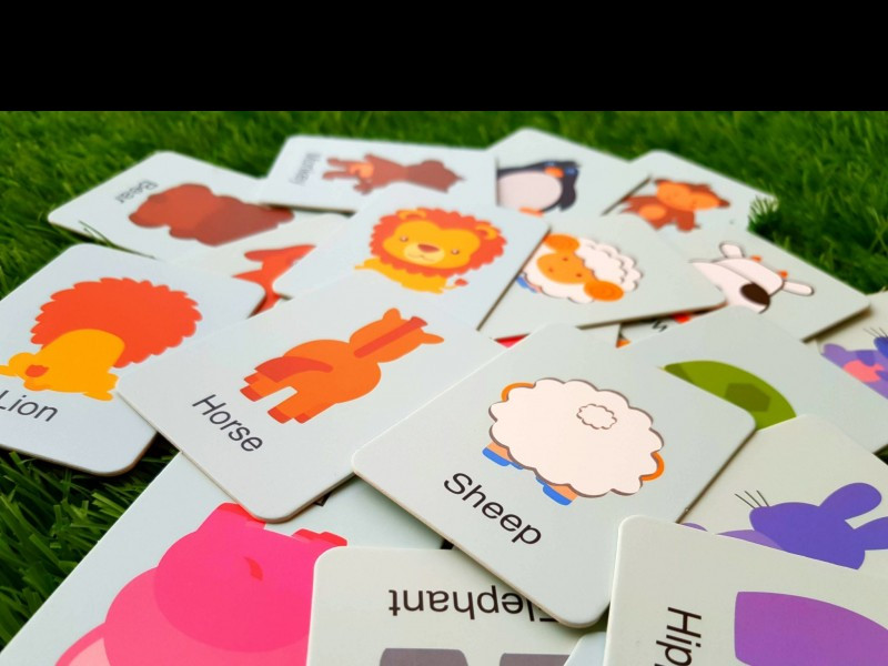 Auf der Karte steht, was auf dem Bild zu sehen ist, auf Englisch, sodass dein Kind auch die Fremdsprache kennenlernen kann.