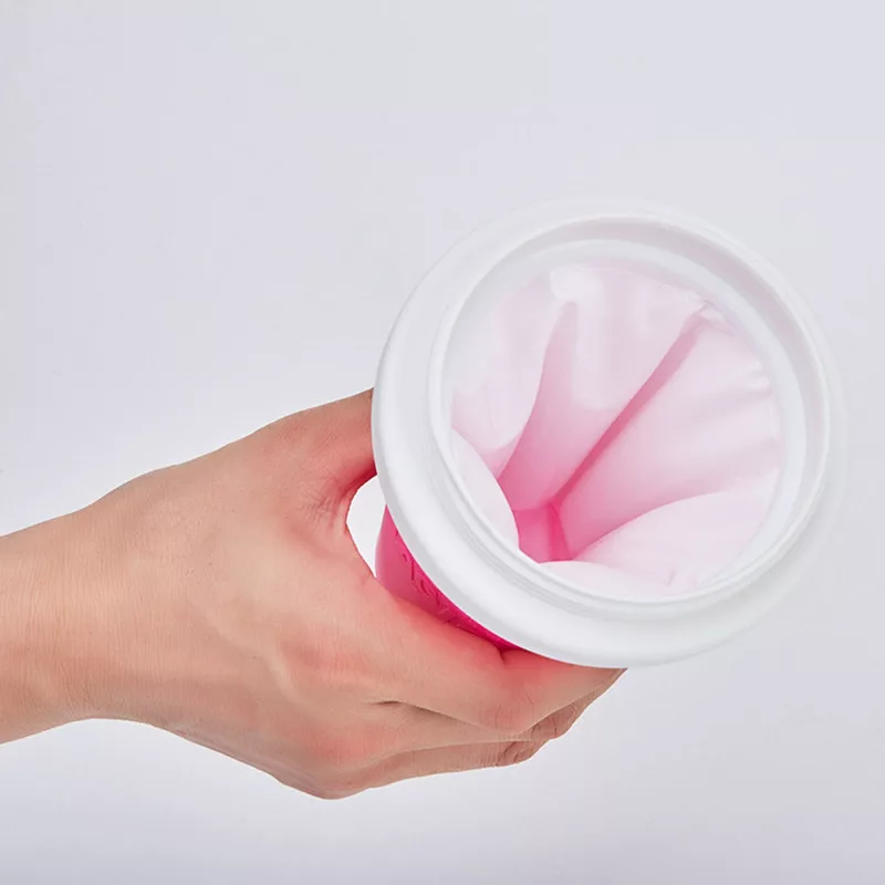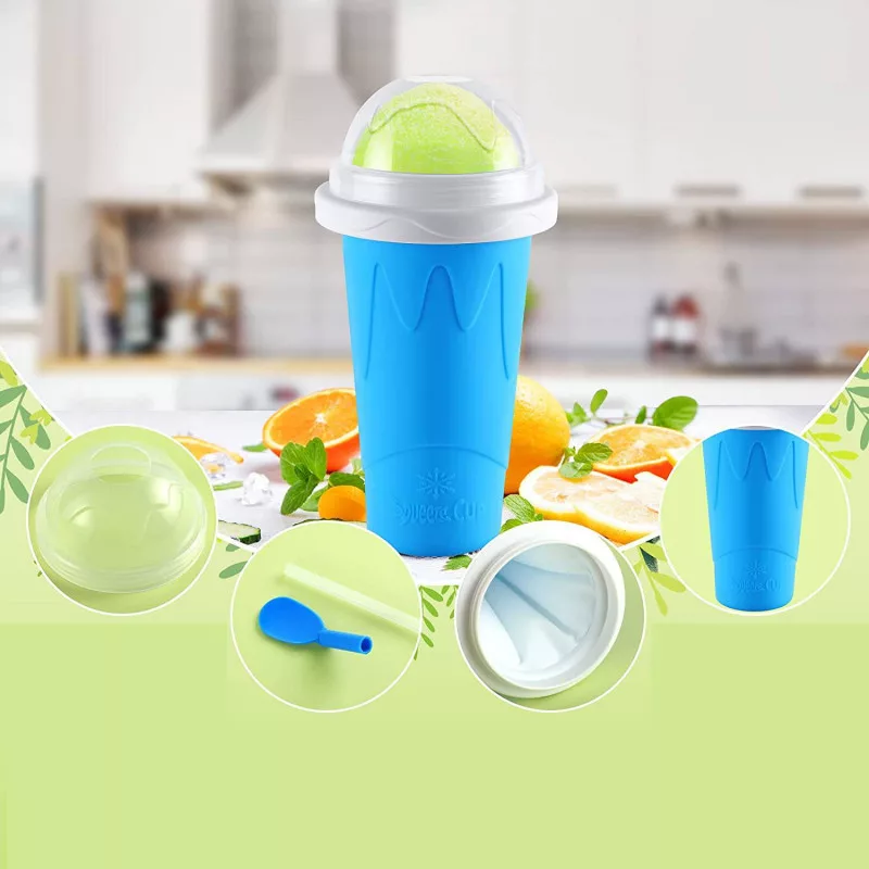 Stelle den Becher für 4-6 Stunden in den Gefrierschrank. Fülle ihn zu 3/4 mit deinem Lieblingsgetränk oder Fruchtsaft. Dann einfach ein paar Mal zusammendrücken und tataa – dein hausgemachter Slushie ist fertig!