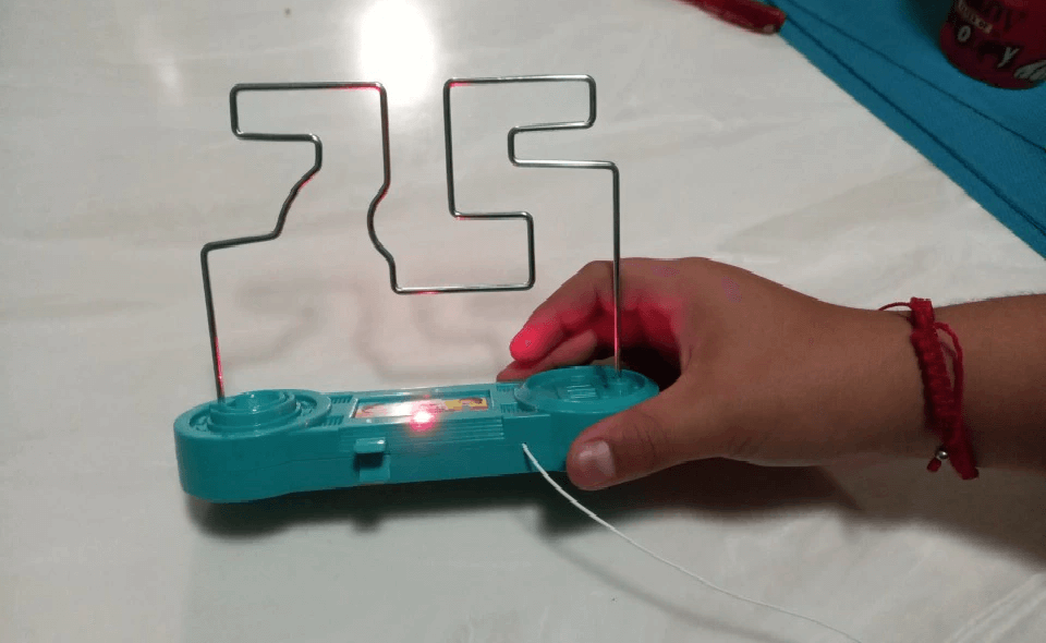 Spielerisch lernen! Du kannst alleine oder mit Freunden und Familie spielen. Führe den Haken durch das Labyrinth, ohne die Metallstange zu berühren, und sei der Geschickteste! Wenn der Haken die Stange berührt, keine Sorge, das Spiel schockt nicht, sondern spielt Musik und ein rotes Licht blinkt auf.
