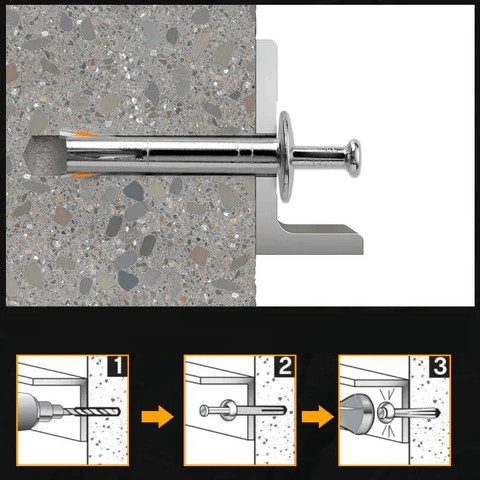 Diese Nieten aus starkem Kohlenstoffstahl bieten mehr Halt und Stabilität in der Wand als herkömmliche Dübel. Normale Dübel brechen schnell und fallen heraus, aber dieses Produkt entfaltet sich im Loch und bleibt fest in der Wand, was eine hohe Belastbarkeit ermöglicht. Dank des robusten Materials ist es strapazierfähig und schwer biegbar, mit hoher Hitze- und Rostbeständigkeit. Die Anwendung ist kinderleicht: Bohre ein Loch in die gewünschte Oberfläche, setze die Niete ein und schlage den Nagel hinein. Universell einsetzbar, ob in Beton- oder Ziegelwänden.