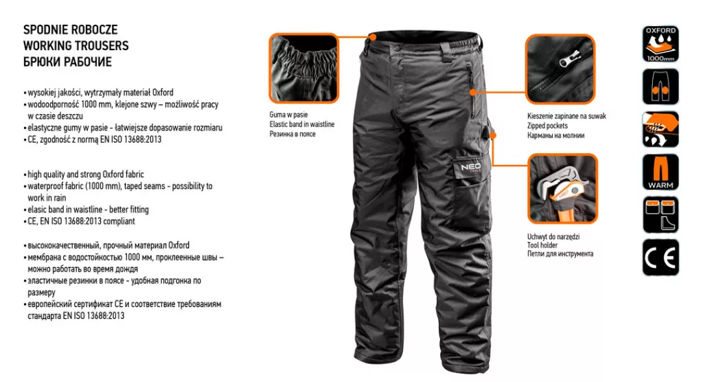 Die NEO gefütterte Arbeitshose besteht aus hochwertigem, strapazierfähigem Oxford 300D Material und ist mit einem leichten Polyesterfutter ausgestattet, das an frostigen Tagen für Komfort sorgt. Die verstärkten Nähte und das Material mit einer Wasserdichtigkeit von 1000 mm ermöglichen das Arbeiten im Regen. Dank des elastischen Bunds passt sich die Größe leicht deiner Figur an. Die Taschen sind leicht zugänglich und bieten Platz für die während der Arbeit benötigten Werkzeuge. Die Werkzeughalter sind auch bei hoher Belastung zuverlässig. Das Produkt ist nach der Norm EN ISO 13688:2013 gefertigt und die europäische Zertifizierung garantiert seine Qualität. Arbeitshose, Oxford, Größe XL, Material Oxford 300D, Polyesterfutter, viele multifunktionale Taschen, Werkzeughalter, elastischer Bund, verstärkte Nähte, wasserabweisend und winddicht, extra isoliert, CE-Zertifikat.