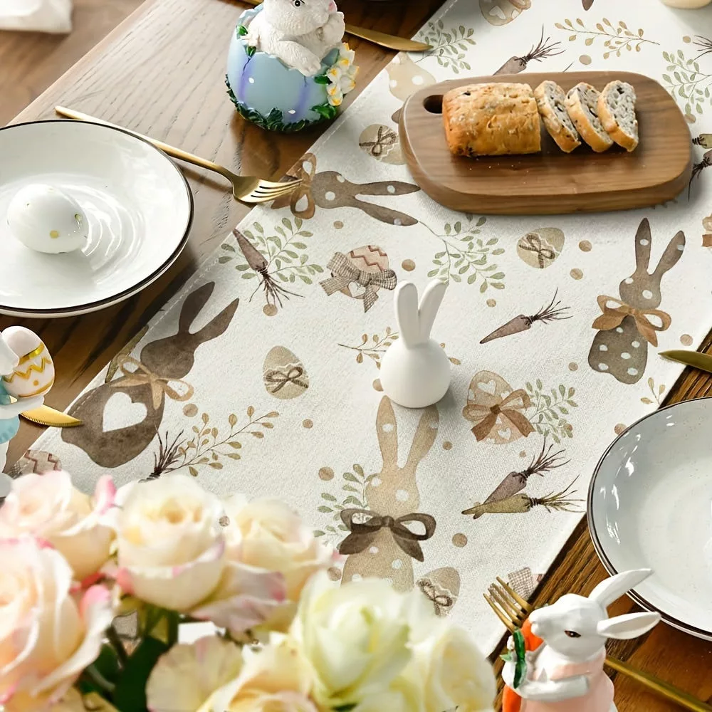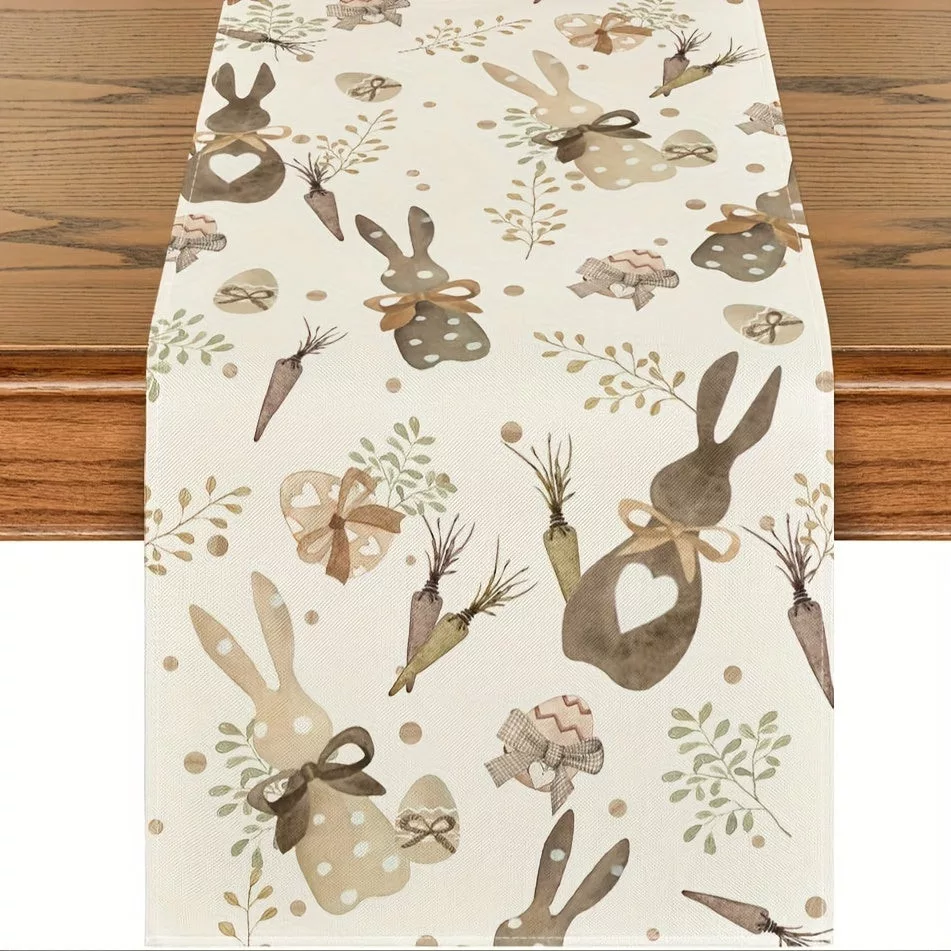 (Tischdekoration) Entdecke den Zauber der Feiertage mit diesem besonderen Oster-Tischläufer mit Hasen- und Karottenmotiven! Die perfekte Wahl, um dein Zuhause in der Frühlingszeit aufzupeppen. Dieser Läufer ist nicht nur praktisch, sondern auch ein stilvolles Accessoire für deinen Esstisch. Die Hasen- und Karottenmuster bringen Frische und Freude in jede Mahlzeit. Hergestellt aus hochwertigem Material, das Langlebigkeit und Beständigkeit garantiert, sodass du die Osterstimmung jahrelang genießen kannst.