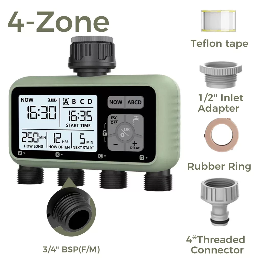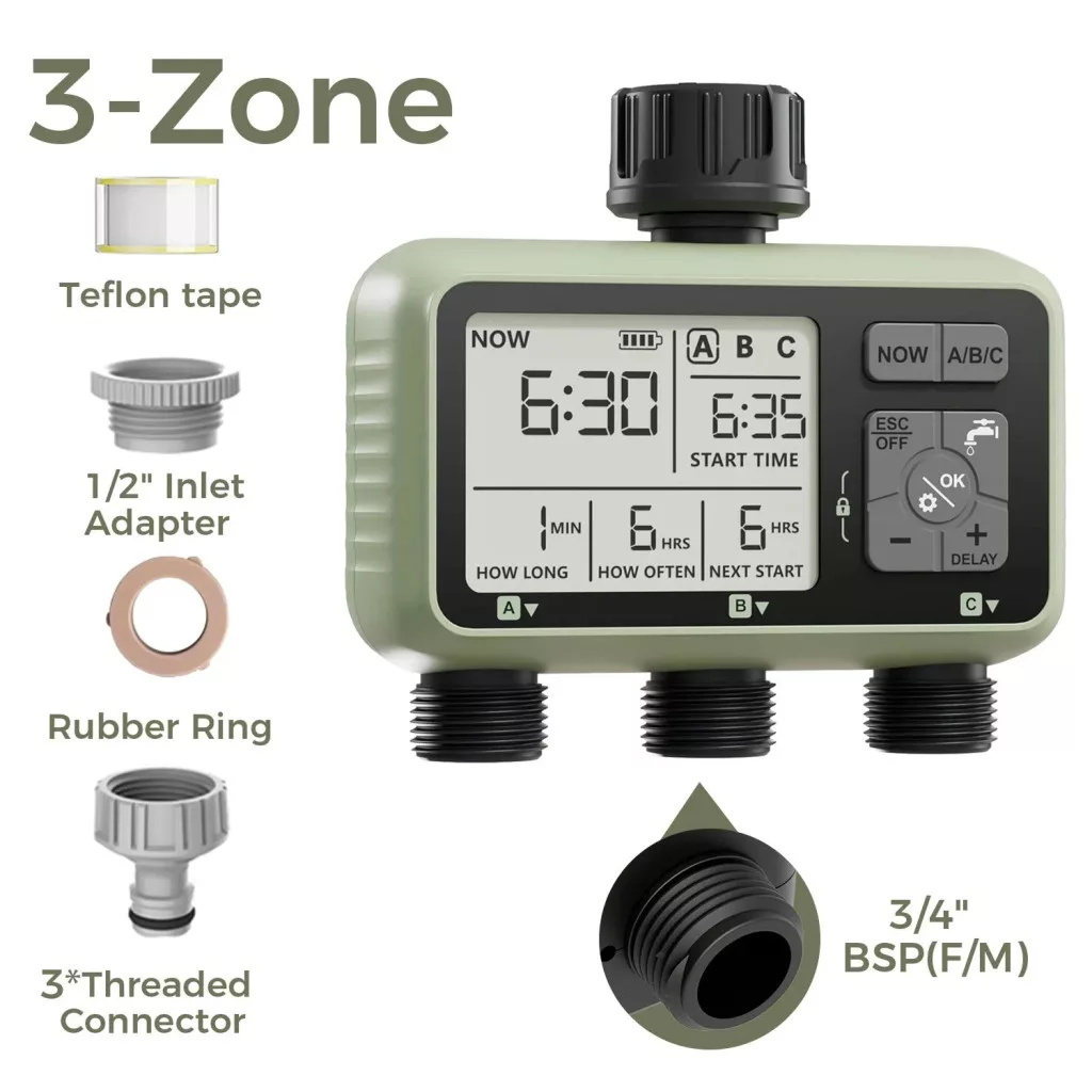 • Programmierte Zonen: Drei separate Zonen: Du kannst sie leicht an verschiedene Bewässerungsbedürfnisse anpassen, sodass jeder Bereich deines Gartens die nötige Aufmerksamkeit erhält.