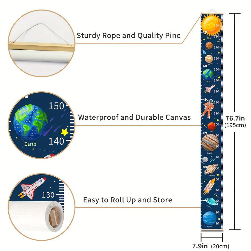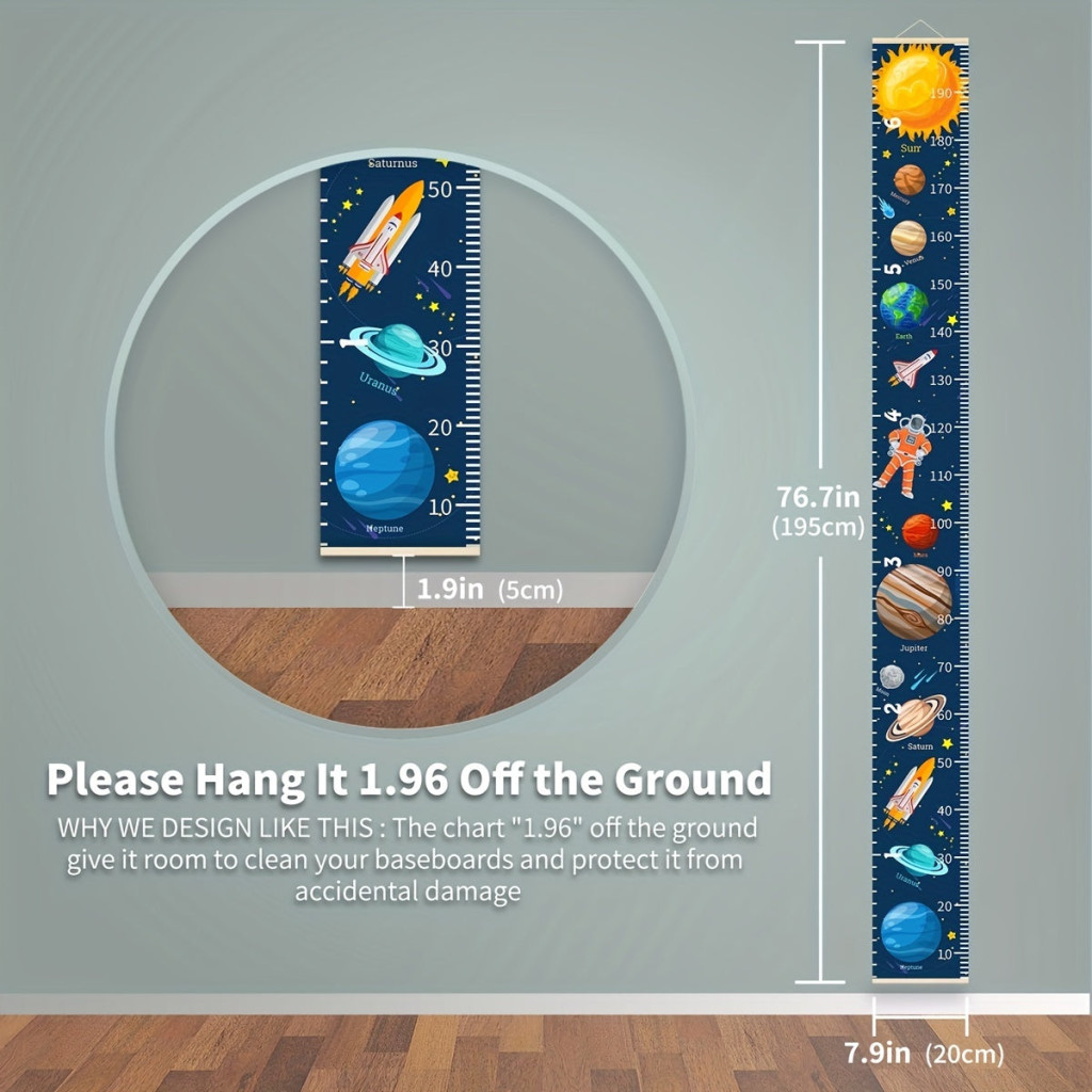 Der Wachstumsmesser ist einfach zu montieren und passt perfekt in jedes Raumdesign. Der blaue Stoff fühlt sich angenehm an und ist langlebig, sodass er der Familie viele Jahre lang Freude bereiten kann. Die detaillierten Planetenabbildungen helfen den Kindern, die Geheimnisse des Sonnensystems zu entdecken, während sie zu aufregenden Abenteuern inspiriert werden. Dieses Produkt wird nicht nur die Kinder, sondern die ganze Familie begeistern.
