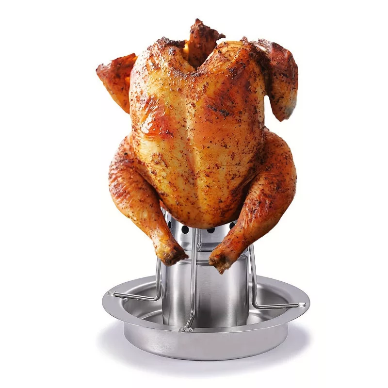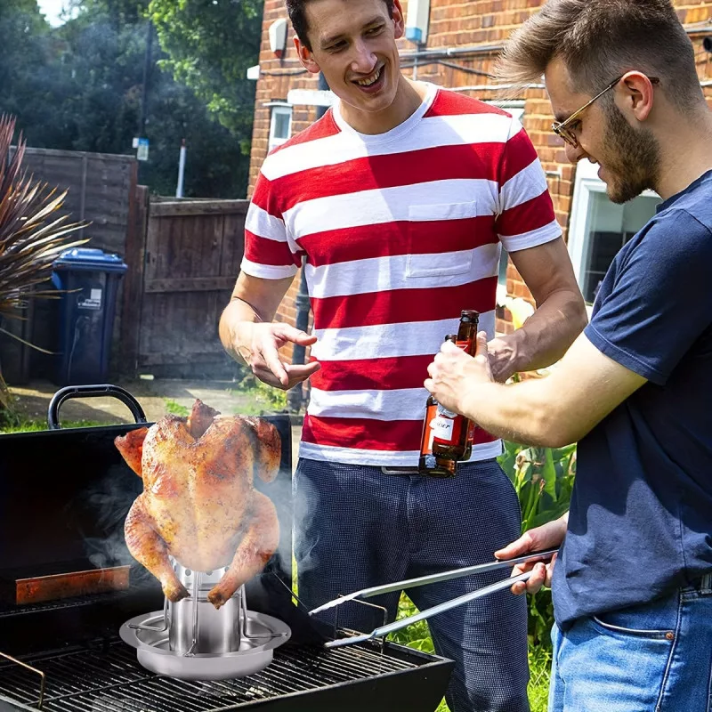Dieser Hähnchenbräter ist das unverzichtbare Zubehör für Grillpartys, mit dem du Hähnchen vertikal braten kannst, um mühelos geschmackvolle Gerichte zuzubereiten. Der Edelstahlständer ist mit einem vertikalen Hähnchenhalter und einer Tropfschale ausgestattet, was das Braten und Reinigen noch einfacher macht. Dadurch wird das Fleisch von allen Seiten gleichmäßig gegart, sodass bei jedem Essen ein perfektes Geschmackserlebnis garantiert ist. Dieser Ständer ist somit die ideale Wahl für Weihnachten oder jede andere Feier, wenn du Gäste im Garten erwartest.