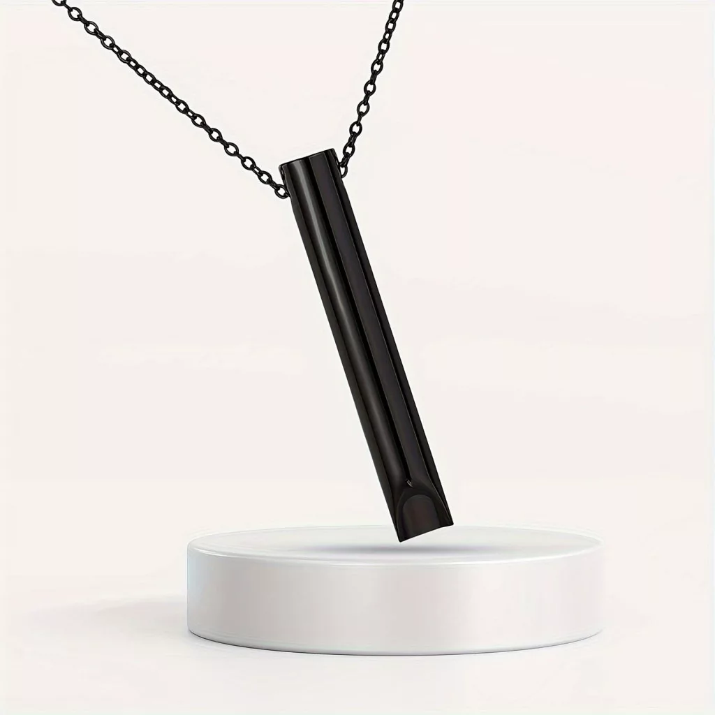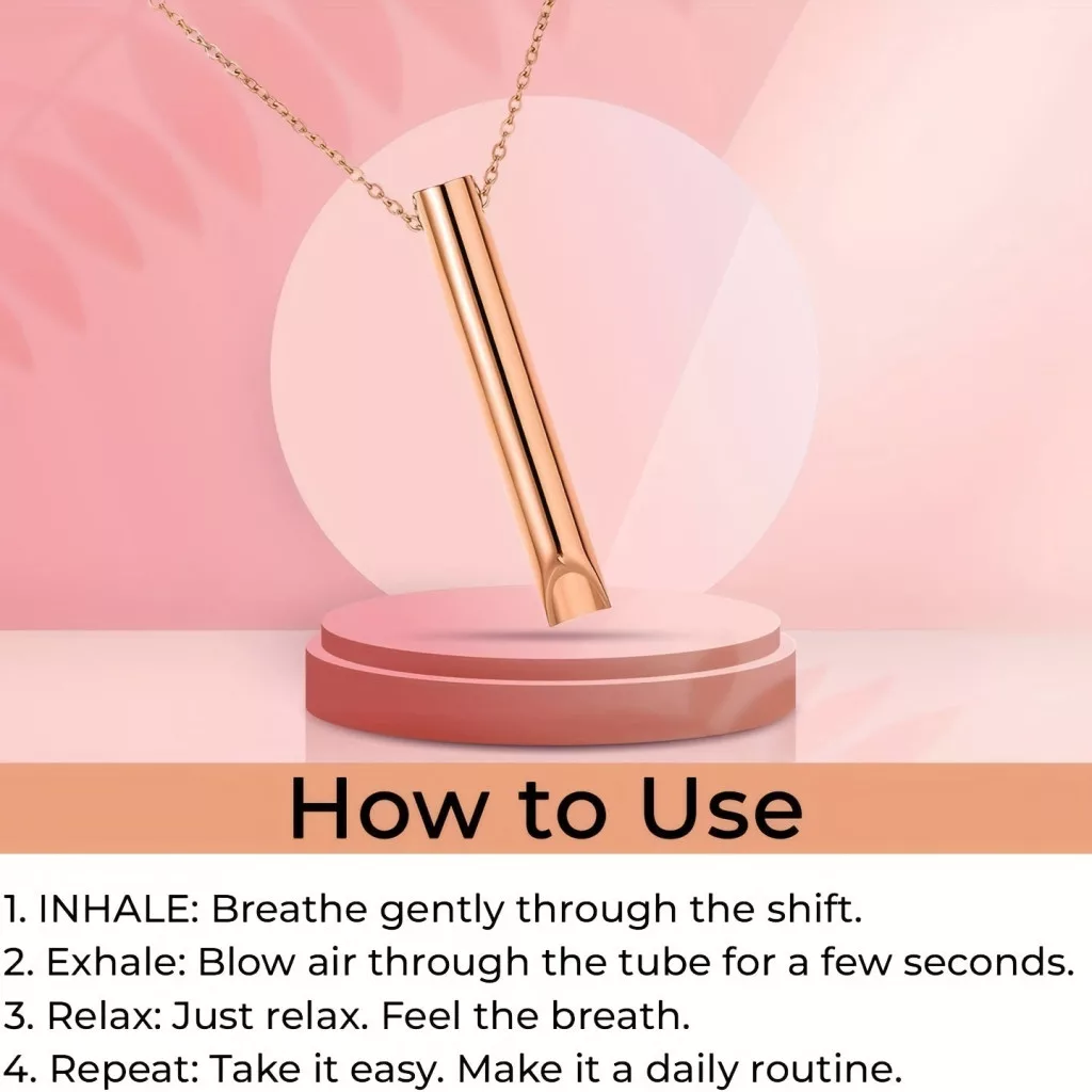 (Funktion) Das Herzstück der Halskette ist das Atemgerät, das so konzipiert wurde, dass es überall und jederzeit leicht zu benutzen ist. Einfach hineinblasen und die beruhigende Wirkung deinen Körper durchströmen lassen. Die Atemtechnik hilft, den Herzschlag zu verlangsamen, Spannungen zu reduzieren und die Konzentration zu verbessern. Der perfekte Begleiter bei Prüfungen, Arbeitsplatzstress oder in jeder angespannten Situation.