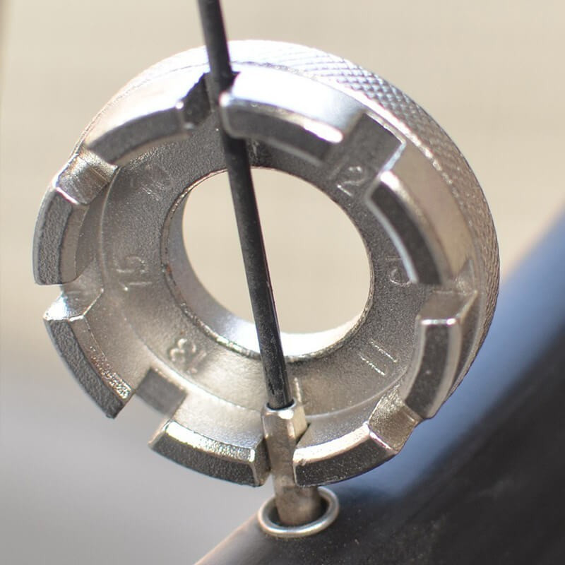 Neben dem Nachziehen der Speichen eignet sich der Speichenschlüssel auch zum Zentrieren der Räder. Du kannst ihn für Reparaturen zu Hause, beim Fahrradbau und in Notfällen unterwegs verwenden.