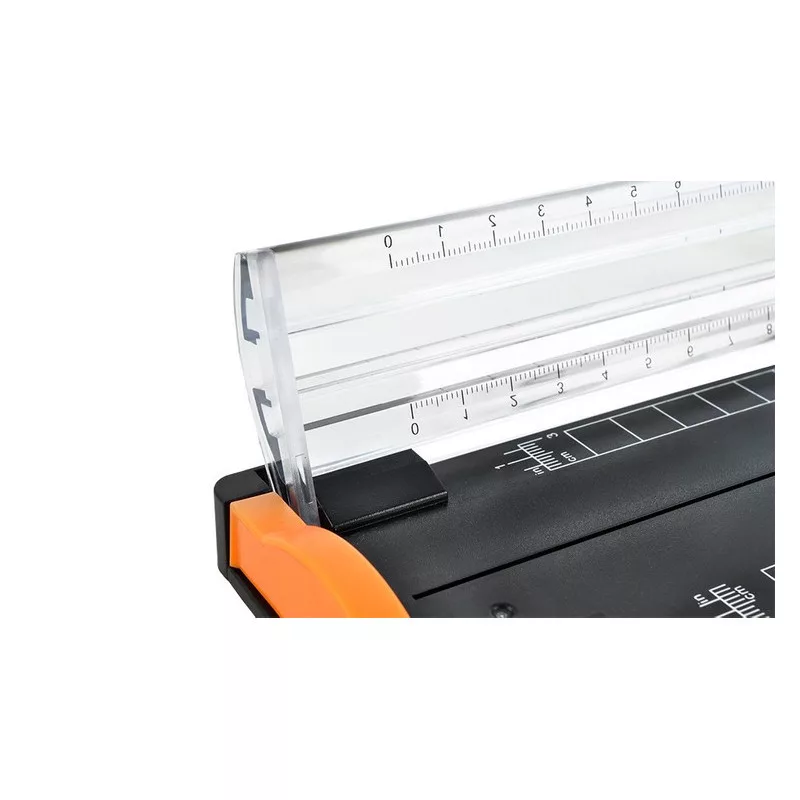 Präzises Schneiden: Die Zentimeter- und Zollskala sowie das Raster ermöglichen eine genaue Positionierung des Papiers vor dem Schneiden.