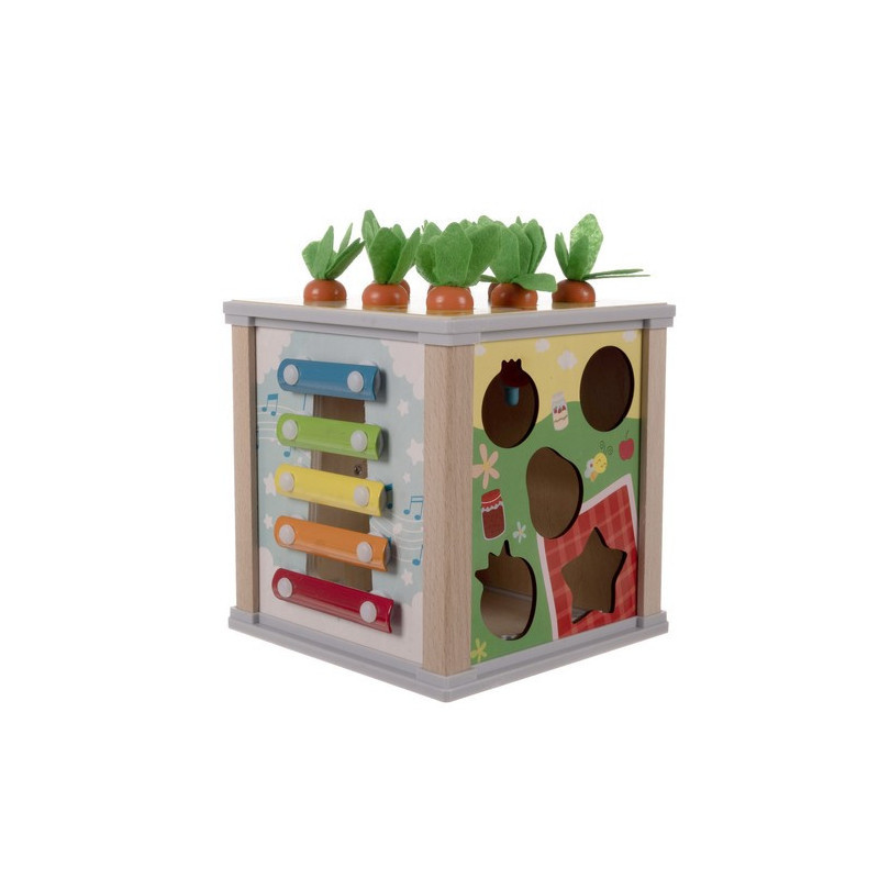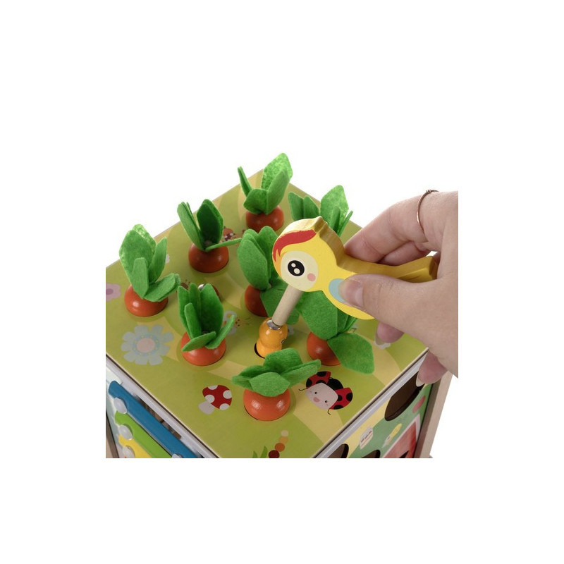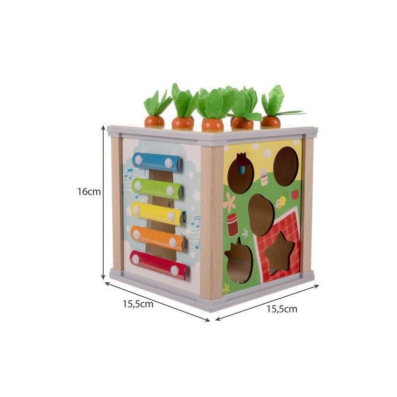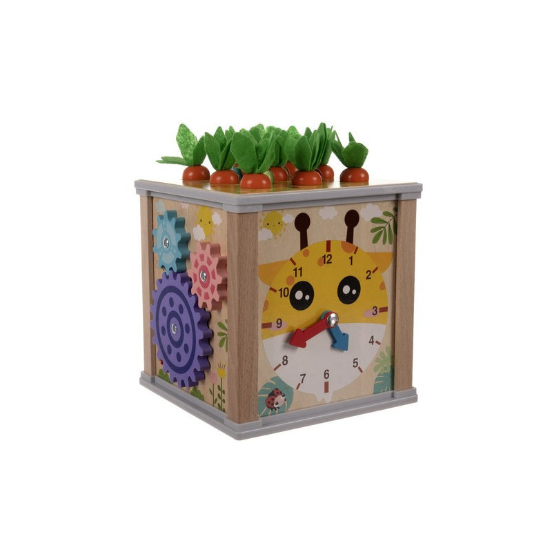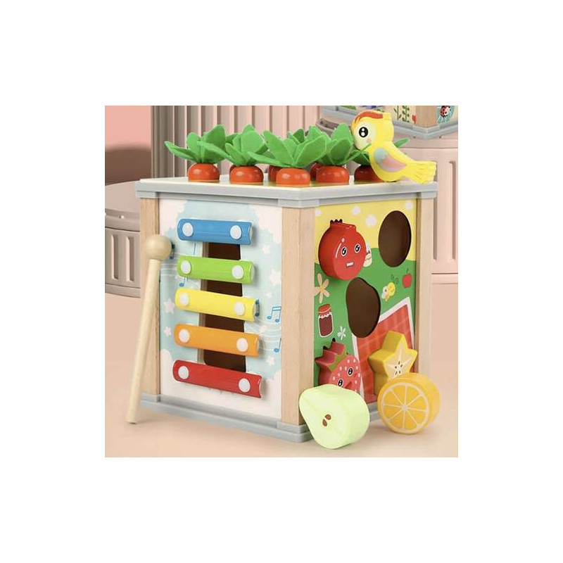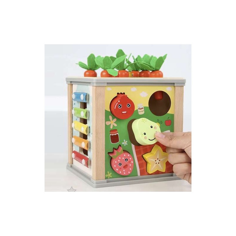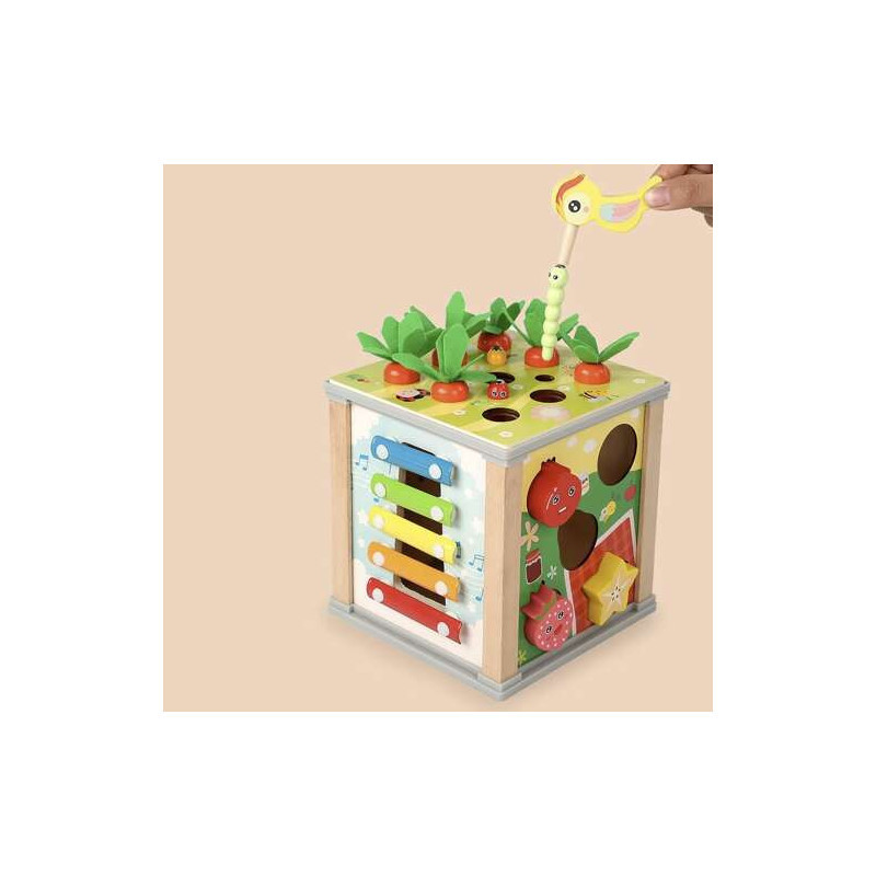Der Deckel des Würfels lässt sich bequem öffnen, sodass du leicht auf die darin enthaltenen Schätze zugreifen oder das Zubehör für das Spiel darin verstecken kannst. Dieser 5-in-1-multifunktionale Lernwürfel bietet auf jeder Seite eine andere kreative Spielmöglichkeit, die zur Entwicklung deines Kindes beiträgt. Du findest darauf ein Xylophon, eine Formensortierbox, Zahnräder, eine Uhr und sogar niedliche magnetische Würmer und Karotten!
