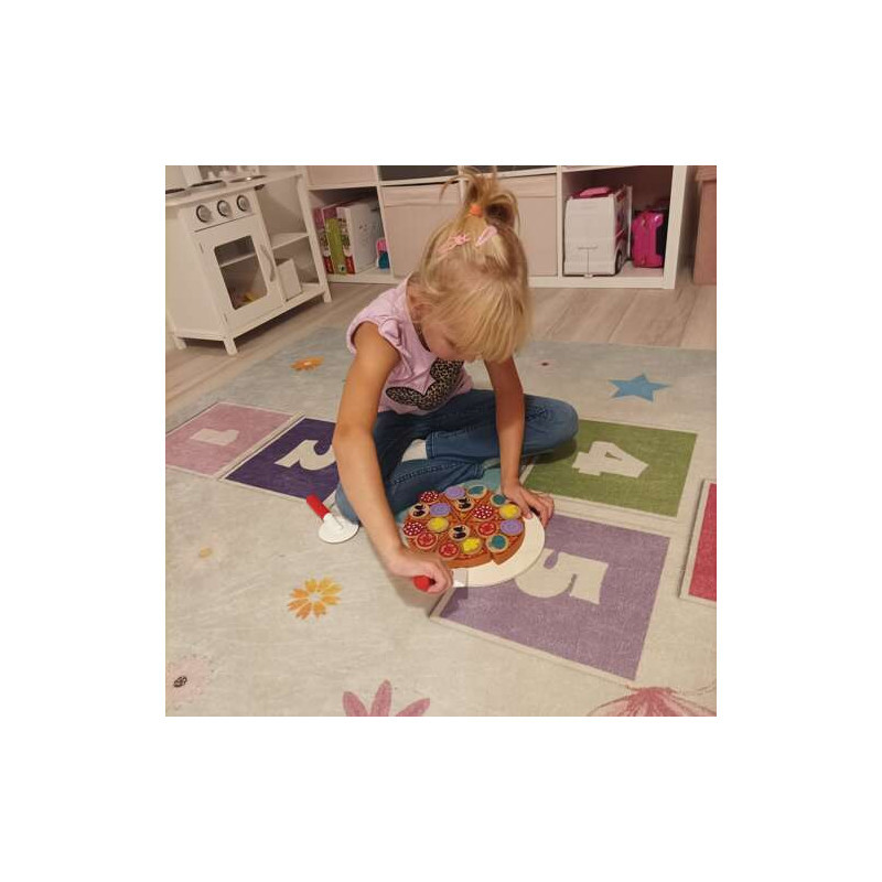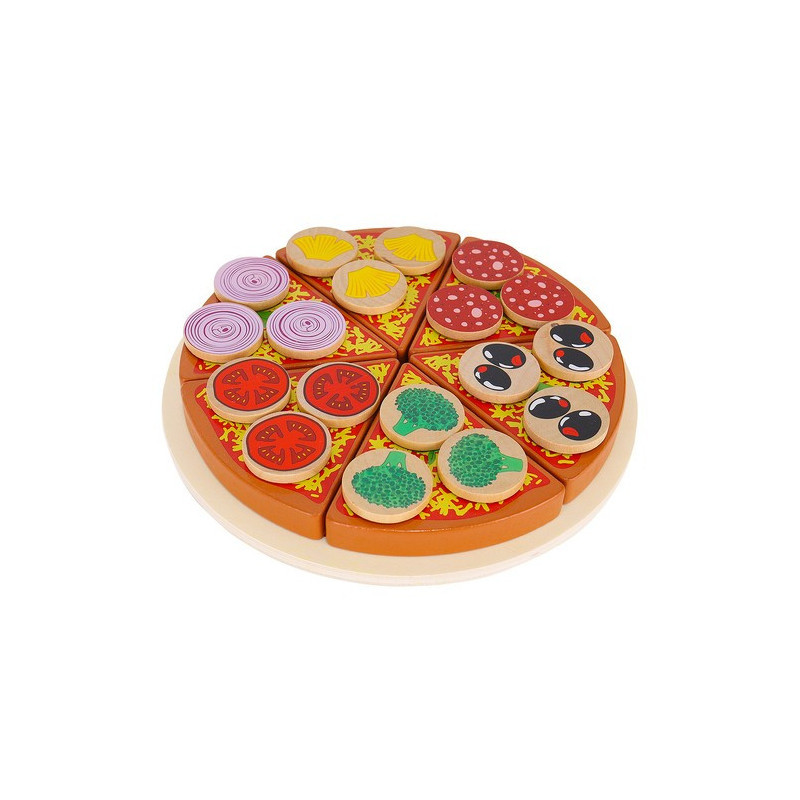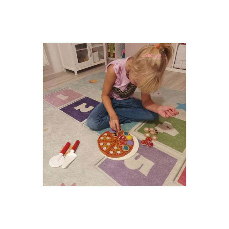 Insgesamt findest du 27 Teile im Paket, die alle aus hochwertigem Holz gefertigt sind und mit einer speziellen, gesundheitlich unbedenklichen Farbe überzogen sind. Dank der Klettverschlüsse kannst du die Pizza immer wieder neu zusammensetzen, nachdem du damit gespielt hast.