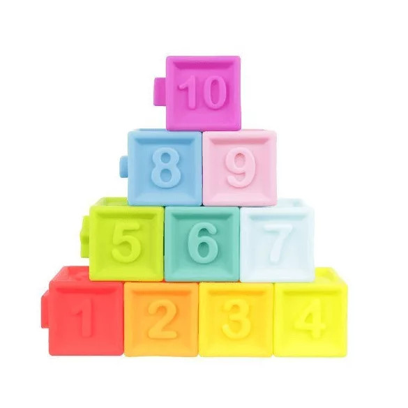 Die Würfel sind mit erhabenen Zahlen, Formen und Tieren verziert, die in fröhlichen Farben leuchten und so perfekt die Entwicklung deines Kindes anregen.