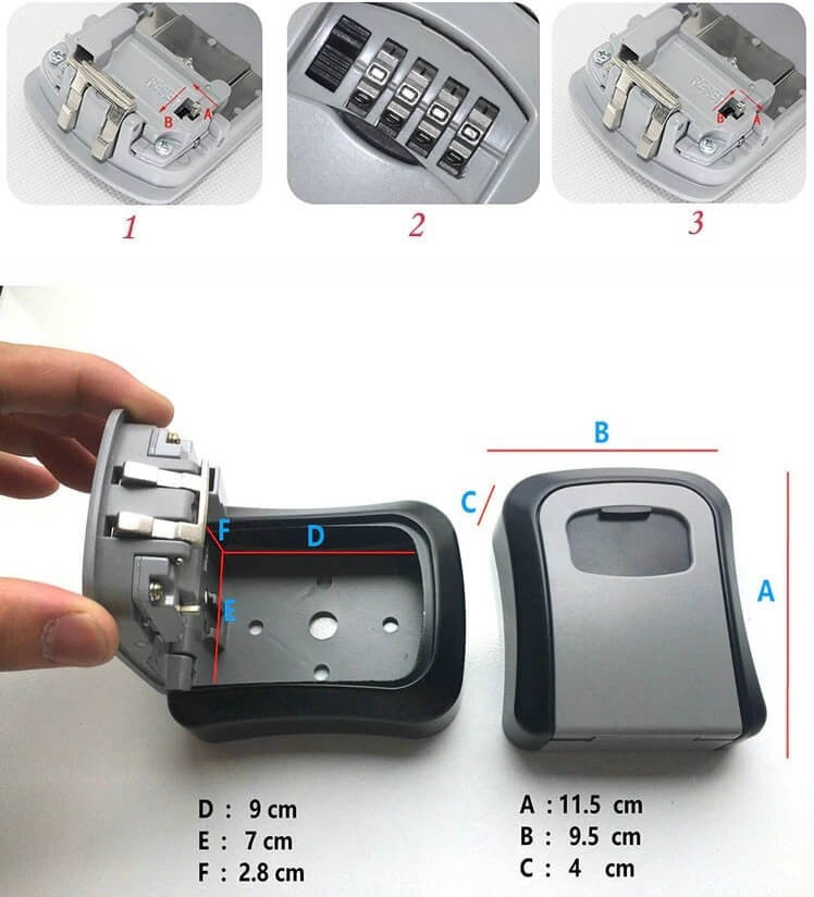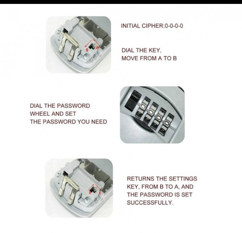 Der Key Safe ist mit einem 4-stelligen Kombinationsschloss ausgestattet. Bei der ersten Inbetriebnahme ist diese Zahlenreihe viermal die 0, deren Änderung wirklich einfach ist. Im geöffneten Zustand befindet sich auf der Rückseite des Deckels ein kleiner Hebel, der in L-Form bewegt werden kann und dessen Endpunkte mit A und B bezeichnet sind. Bewege den Hebel zuerst von A nach B und stelle dann am Schloss das neue Passwort ein, das du in Zukunft verwenden möchtest. Wenn du damit fertig bist, schiebe den Hebel von B nach A zurück, und schon hast du den Code erfolgreich geändert.